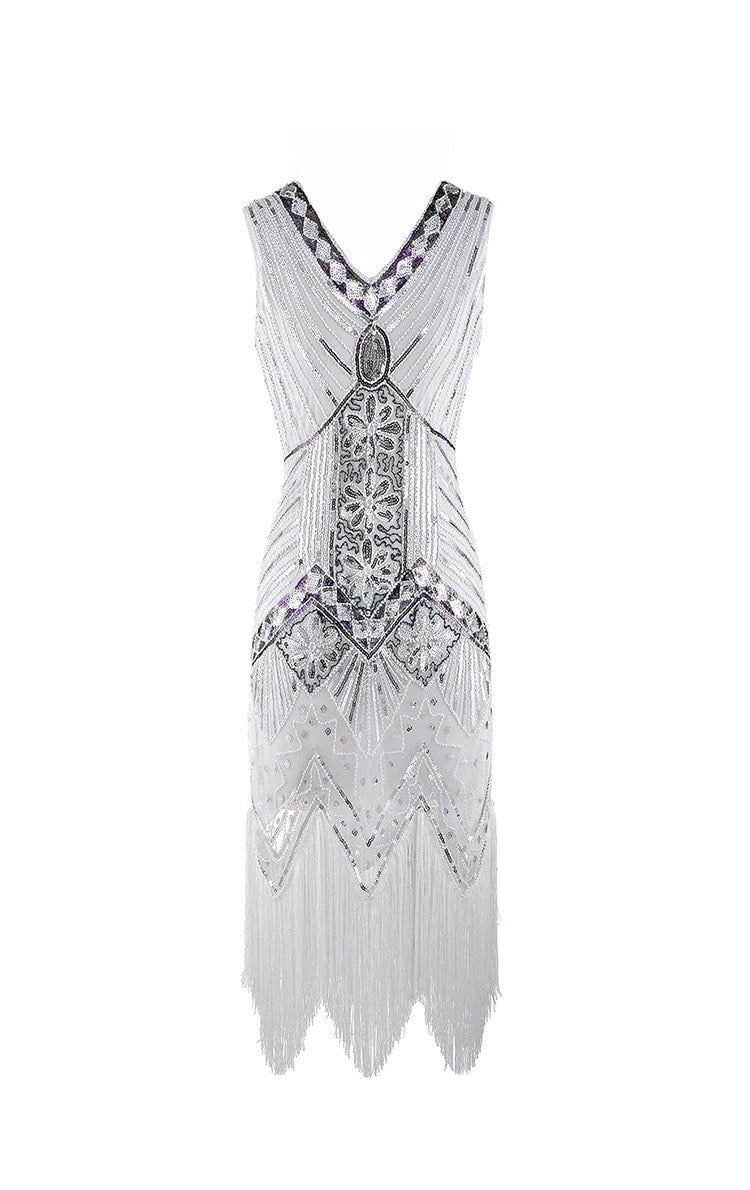Chaque élément de cette robe Gatsby blanche a été pensé pour sublimer votre allure. Les franges délicates et le design sans manches confèrent à cette pièce une légèreté et une sophistication incomparables, parfaites pour un mariage ou une soirée thématique.